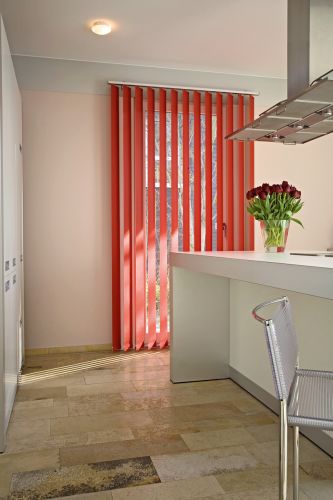 Raumgestaltung mit farbigen Vertikal-Jalousien darf auch zum Staunen führen. Wie diese rote Jalousien-Anlage im Küchen-Esszimmerbereich.